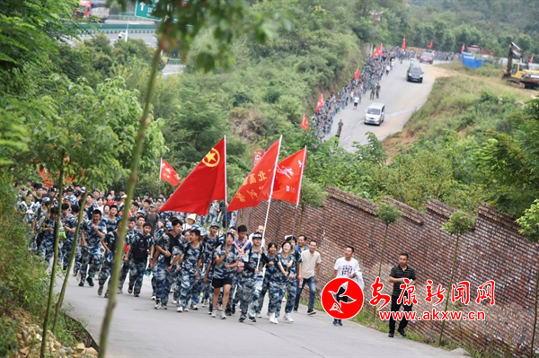 7時30分,校門兩側(cè)早已站滿了初一的學(xué)弟學(xué)妹們,他們揮動著手中的小紅旗,為即將遠足的哥哥姐姐們加油助威。浩浩蕩蕩的隊伍,在軍訓(xùn)教官以及校領(lǐng)導(dǎo)、老師們的帶領(lǐng)下,踏上遠足的征途。整齊的迷彩方隊,豎起的一面面班旗,成為晨曦中最亮麗的風景。同學(xué)們精神抖擻,一路歡歌,一路笑語,口號聲、吶喊聲此起起伏。