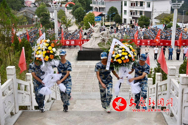 在戰(zhàn)斗紀念碑前,大家集體默哀,并向烈士敬獻花籃。講解員生動講述著牛蹄嶺的戰(zhàn)斗事跡,在場的每一位仿佛回到了那個戰(zhàn)火紛飛的年代,真切感受到革命先烈不怕犧牲、甘于奉獻的紅色精神。隨后,校黨總支副書記徐信濤作了題為“賡續(xù)紅色基因,肩負祖國未來”的報告。徐書記從18歲烈士陳祥榕以身護國講到東京奧運會上14歲少女全紅嬋為國爭光,再到習近平總書記來陜考察對青年學(xué)生的深切寄語,希望同學(xué)們在高中新起點上,扣好人生的“第一粒扣子”,立大志,明大德,成大才,擔大任,以自己的優(yōu)異成績告慰革命先烈,以自己的優(yōu)異表現(xiàn)實現(xiàn)強國夢想。接著,在高一年級郭紅梅老師的帶領(lǐng)下,全體學(xué)生面對紀念碑莊嚴宣誓,錚錚誓言,清澈響亮,無不透露出新時代少年報效祖國的堅定信心。