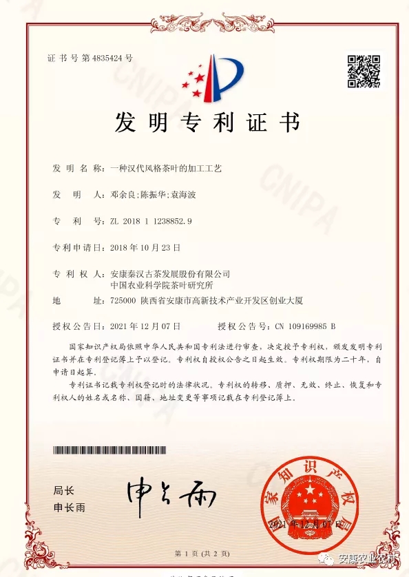 近日,由安康秦漢古茶發(fā)展股份有限公司和中國農(nóng)業(yè)科學(xué)院茶葉研究所聯(lián)合申報(bào)的發(fā)明專利“一種漢代風(fēng)格茶葉的加工工藝”獲得國家知識產(chǎn)權(quán)局授權(quán)(專利號:ZL201811238852.9),自此安康最早的茶有了法律保障(專利法)。