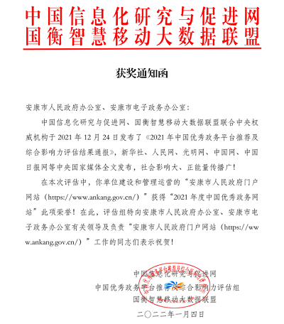 本網(wǎng)訊(通訊員 葉苗) 日前,中國信息化研究與促進(jìn)網(wǎng)、國衡智慧移動(dòng)大數(shù)據(jù)聯(lián)盟聯(lián)合中央權(quán)威機(jī)構(gòu)發(fā)布《2021年中國優(yōu)秀政務(wù)平臺(tái)推薦及綜合影響力評(píng)估結(jié)果通報(bào)》,安康市人民政府網(wǎng)站獲評(píng)“2021年度中國優(yōu)秀政務(wù)網(wǎng)站”,新華社、人民網(wǎng)、光明網(wǎng)、中國網(wǎng)、中國日?qǐng)?bào)網(wǎng)等中央國家媒體全文發(fā)布。
