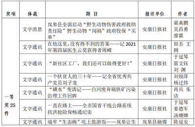 獲得本次安康新聞獎作品共計114件,其中一等獎25件(報紙類10件,電視廣播類10件,新媒體類5件)、二等獎40件(報紙類15件,電視廣播類15件,新媒體類10件)、三等獎49件(報紙類20件,電視廣播類16件,新媒體類13件)。張俊等16名同志獲得安康市優(yōu)秀新聞工作者稱號。從評選的范圍、內(nèi)容、體裁、形式等方面看,都好于往年。