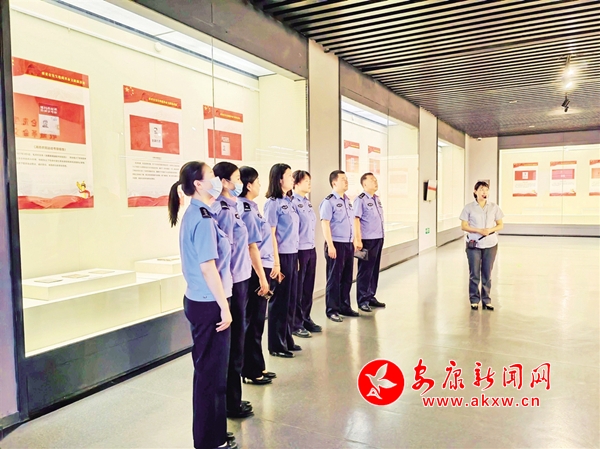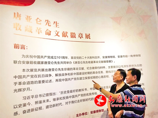 盛夏七月,炎陽似火。安康市博物館三樓唐亞侖先生收藏革命文獻徽章展廳內(nèi),人頭攢動,或有家長為身邊的孩子小聲念著解說詞,或有青少年在紅色徽章面前駐足細細觀察。