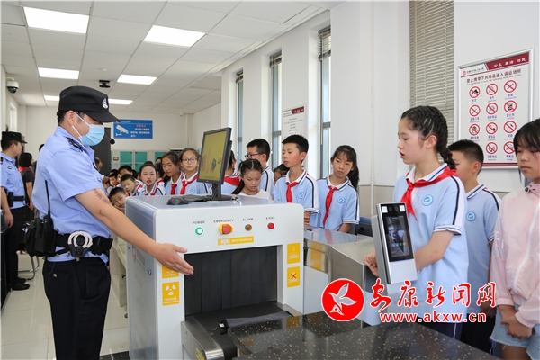 同學(xué)們在法警帶領(lǐng)下,依次經(jīng)過安檢門。更讓同學(xué)們好奇的是法警小哥的警用裝備,同學(xué)們認真聆聽法警對每樣警用裝備的講解,還不時發(fā)問,興趣盎然。隨后,同學(xué)們依次參觀了法庭、羈押室和全國維護婦女兒童權(quán)益先進集體工作室,對法庭開庭審理案件、羈押犯罪嫌疑人和保護婦女兒童權(quán)益等知識有了更深入的認識和了解。