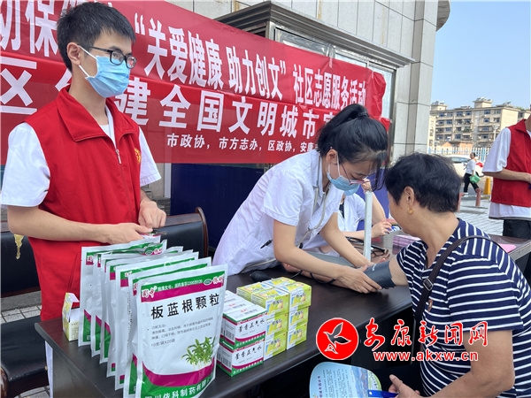 活動(dòng)現(xiàn)場(chǎng),醫(yī)務(wù)人員為社區(qū)居民聽(tīng)診、測(cè)量血壓,耐心地詢問(wèn)他們的身體狀況并進(jìn)行健康指導(dǎo),免費(fèi)發(fā)放了板藍(lán)根顆粒、藿香正氣水等常用藥品。向前來(lái)義診的居民發(fā)放健康宣傳資料,講解了高血壓、糖尿病、婦女兒童健康保健知識(shí)以及定期檢查身體的重要性,倡導(dǎo)居民積極樂(lè)觀的生活態(tài)度,養(yǎng)成健康生活習(xí)慣。