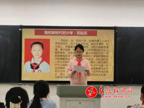 學(xué)校利用國(guó)旗下講話向全體隊(duì)員發(fā)出向“新時(shí)代好少年”學(xué)習(xí)的倡議,該校安康市新時(shí)代好少年榮譽(yù)稱號(hào)獲得者——蘇耘樂(lè)講述了她在日常學(xué)習(xí)和生活上的感受及獲得榮譽(yù)稱號(hào)的經(jīng)歷和所付出的努力,號(hào)召全體隊(duì)員們積極行動(dòng)起來(lái),從一點(diǎn)一滴做起,從一言一行做起,從小樹立遠(yuǎn)大的理想,掌握豐富的知識(shí),培養(yǎng)良好的心理素質(zhì),以積極進(jìn)取迎接未來(lái)的挑戰(zhàn)。