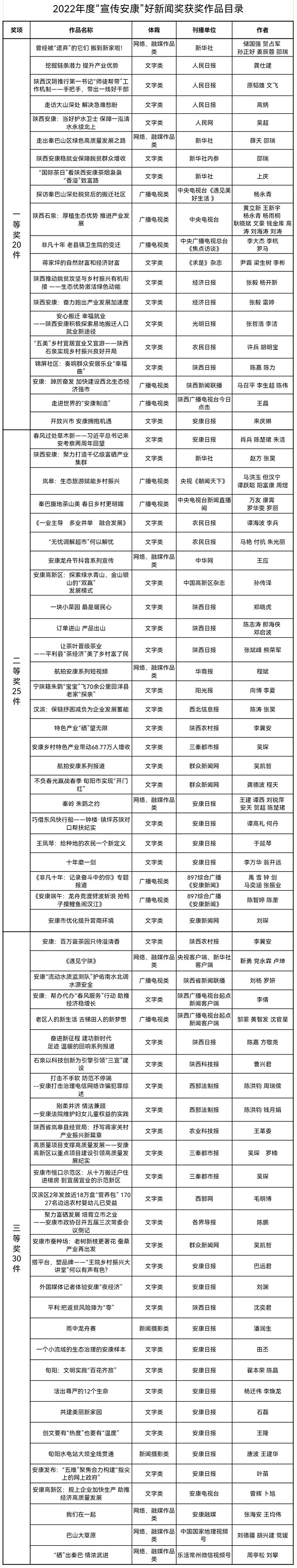 為充分發(fā)揮“宣傳安康”優(yōu)秀新聞作品示范作用,進(jìn)一步激勵(lì)廣大新聞工作者奮發(fā)有為,爭(zhēng)先創(chuàng)優(yōu)。經(jīng)過各申報(bào)單位推薦,市委宣傳部初審、復(fù)審并組織專家定評(píng),評(píng)選出擬獲2022年度“宣傳安康”好新聞獎(jiǎng)件75件,其中一等獎(jiǎng)20件、二等獎(jiǎng)25件、三等獎(jiǎng)30件。