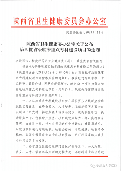 近日,陜西省衛(wèi)生健康委發(fā)文公布了第四批省級臨床重點專科建設項目名單,安康市人民醫(yī)院腫瘤內科名列其中,順利被評定為省級臨床重點?平ㄔO項目。