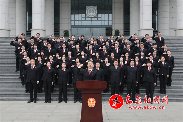 上午10時,在莊嚴的國歌聲中,四名法警正步護送國旗入場。隨后,院長劉娟走向領誓臺,左手撫按憲法,右手舉拳,領誦誓詞。全體班子成員、法官干警共67人高舉右拳,以錚錚誓言許下對憲法的忠誠和對人民的莊嚴承諾。