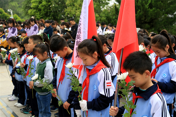 全體師生列隊(duì)紀(jì)念碑前,為革命先烈獻(xiàn)花默哀。每一個(gè)人的心中都在向革命先烈們?cè)?jīng)所經(jīng)歷的風(fēng)霜雪雨、艱苦磨難致敬,為他們復(fù)興中華、赴湯蹈火的崇高精神致敬。