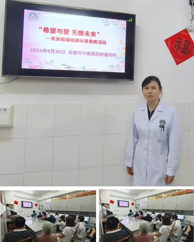 疼痛是人類的第五大生命體征,是癌癥患者最常見和最難以忍受的癥狀之一,70%的晚期癌癥患者伴有疼痛。為了更多地普及癌痛知識,造福疼痛患者,2024年5月30日下午市中醫(yī)醫(yī)院內科第三黨支部腫瘤內科開展“黨建引領踐初心 愛心匯聚暖人心”——“希望與愛 無痛未來”關愛癌痛健康宣教活動。腫瘤內科主任嚴麗、副主任馬紅兵等醫(yī)護人員、患者及家屬共30余人參加了此次活動。