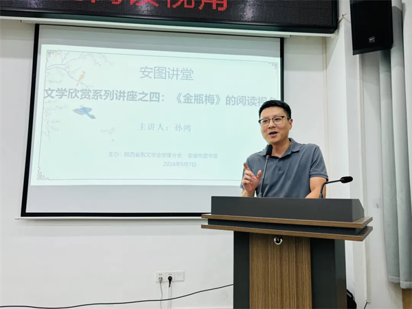 由陜西省散文學(xué)會安康分會攜手安康市圖書館主辦的“文學(xué)欣賞系列”講座,于9月7日舉辦第四場。平時定員50人的市圖書館多功能廳,當(dāng)日擠了83人。來自全市各地的作家、文學(xué)愛好者共同聆聽了安康學(xué)院教授孫鴻主講的《〈金瓶梅〉的閱讀視角》。L7h安康新聞網(wǎng)