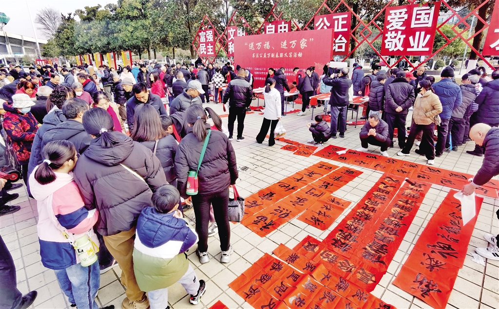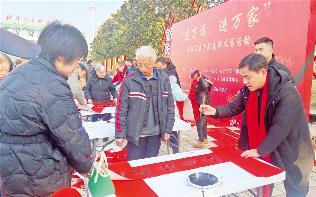 活動現(xiàn)場,人頭攢動,長桌一字擺開,書法家們精神飽滿,手中的毛筆飽蘸濃墨,筆鋒游走間,楷、行、隸、草等多種書體各顯神韻,一副副滿載祝福的春聯(lián)、一張張承載希望的“福”字躍然紙上,飽含著濃濃年味兒,寄托著人們對新年的美好憧憬與希望。前來領取春聯(lián)的市民絡繹不絕,大家一邊欣賞書法創(chuàng)作,一邊挑選著心儀的春聯(lián)內(nèi)容,現(xiàn)場氣氛熱烈融洽;顒舆將在安康高新區(qū)、西城坊、部分旅游景點等地持續(xù)進行。(記者 陸青波 攝)