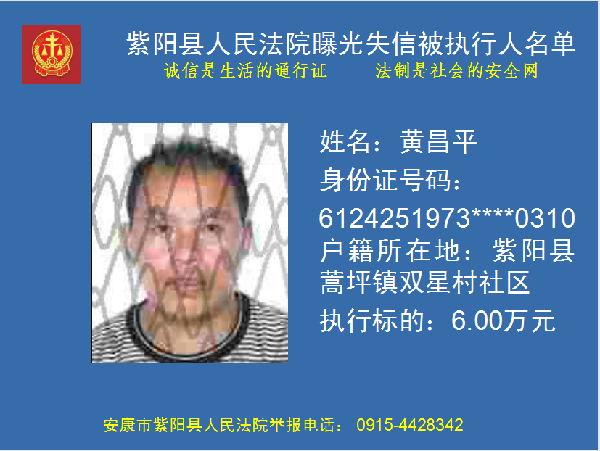 被執(zhí)行人黃昌平,你因不履行(2017)陜0924民初241號民事判決書確定的義務(wù),已被紫陽縣人民法院納入失信被執(zhí)行人名單庫依法進行信用懲戒。信用懲戒范圍包括但不限于以下措施: