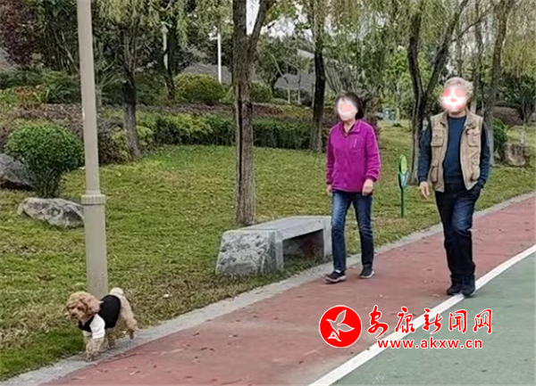 11月9日上午,漢江公園人行步道,有市民遛狗未牽繩。(圖文/馬歡)2w8安康新聞網(wǎng)