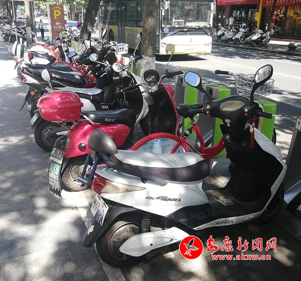 本網(wǎng)訊(記者 牟慶紅)7月31日,記者在興安中路一商城門(mén)前發(fā)現(xiàn),大量摩托車(chē)、電動(dòng)車(chē)扎堆停放在城市公共自行車(chē)樁旁,使得公共自行車(chē)無(wú)法?俊