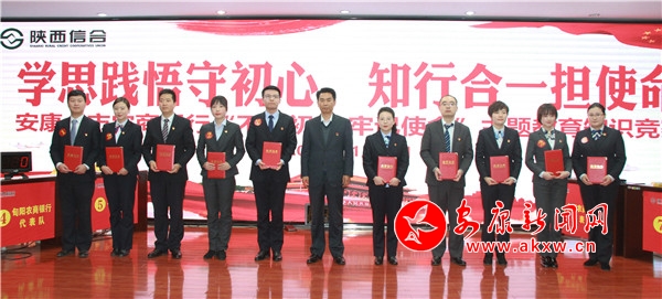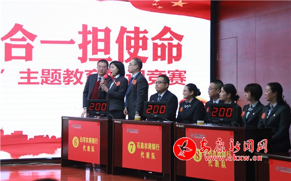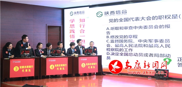 據(jù)了解,本次活動(dòng)以“學(xué)思踐悟守初心,知行合一擔(dān)使命”為主題,以習(xí)近平新時(shí)代中國(guó)特色社會(huì)主義思想、黨的十九屆四中全會(huì)精神、黨章黨規(guī)、掃黑除惡專項(xiàng)斗爭(zhēng)應(yīng)知應(yīng)會(huì)知識(shí)等為競(jìng)賽內(nèi)容,設(shè)置必答、搶答、風(fēng)險(xiǎn)、加試等環(huán)節(jié)進(jìn)行,來(lái)自安康各縣區(qū)農(nóng)商行10個(gè)代表隊(duì),共30名選手參與競(jìng)答。賽場(chǎng)上,氛圍緊張激烈,你追我趕,尤其在搶答題環(huán)節(jié),搶答令一經(jīng)發(fā)出,各隊(duì)選手立即開(kāi)始爭(zhēng)相搶拍競(jìng)答器,比分稍微落后的隊(duì)伍在搶到答題權(quán)后,出色作答后贏得現(xiàn)場(chǎng)陣陣掌聲,即使答錯(cuò),選手們也毫不氣餒,互相鼓勵(lì),立即調(diào)整狀態(tài)準(zhǔn)備下一次搶答。比賽現(xiàn)場(chǎng)精彩紛呈,觀眾不時(shí)為選手們精準(zhǔn)的回答報(bào)以熱烈的掌聲。