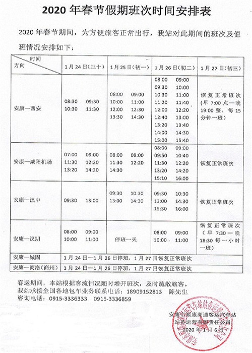 在春運期間客流量增多的情況下,安康高速客運站將根據(jù)客流量情況,臨時增加班次。春節(jié)期間準備出行的朋友請根據(jù)更改后的班車時刻表調(diào)整出行時間。