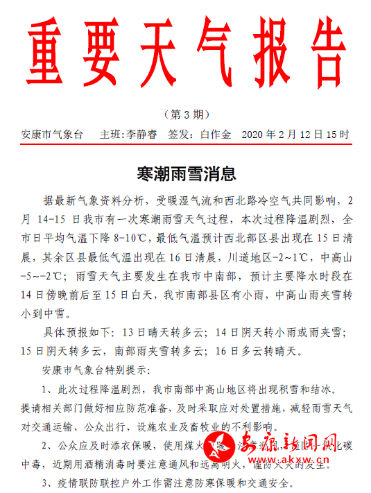 市氣象臺(tái)特別提示,此次過(guò)程降溫劇烈,我市南部中高山地區(qū)將出現(xiàn)積雪和結(jié)冰提請(qǐng)相關(guān)部門(mén)做好相應(yīng)防范準(zhǔn)備;公眾應(yīng)及時(shí)添衣保暖,使用煤火取暖時(shí)注意通風(fēng),謹(jǐn)防一氧化碳中毒,近期用酒精消毒時(shí)要注意通風(fēng)和遠(yuǎn)離明火,謹(jǐn)防火災(zāi)的發(fā)生;疫情聯(lián)防聯(lián)控戶外工作需注意防寒保暖和交通安全。uRM安康新聞網(wǎng)