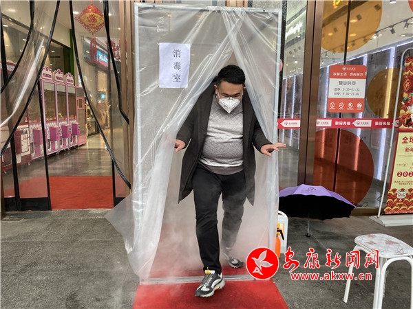 記者來到位于金州路的金坊國際購物廣場,該商場門口設(shè)置有一個顯眼的消毒室,前來購物的顧客須先測量體溫,然后進入消毒室消毒五秒以上,完成消殺過程,才能進去商場選購貨品。