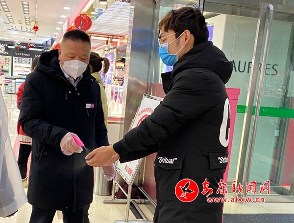 記者來到位于金州南路的時代購物廣場,觀察到店門口設(shè)有專門的測溫點,每個前來的顧客都需要先進行體溫測量,然后由工作人員對顧客的手部進行消毒,盡量保證顧客在選購貨品的時候不會產(chǎn)生交叉感染。同時,地上鋪有消毒地墊,每個顧客都需要踏上去對鞋底就行消毒。