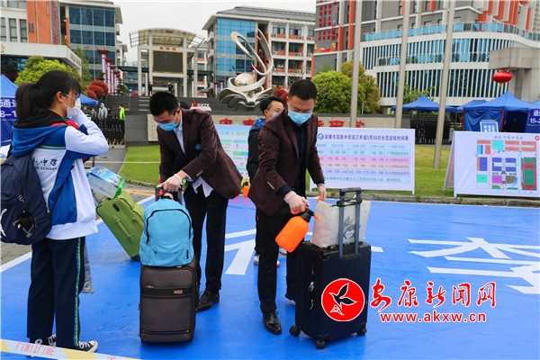 工作人員與老師在校門口有條不紊地開(kāi)展著校園防疫工作,測(cè)體溫、查看“健康碼”、對(duì)行李及物品進(jìn)行消毒等工作有序進(jìn)行著。學(xué)校高三年級(jí)29個(gè)班、1300多名學(xué)生實(shí)行錯(cuò)峰報(bào)到,在今天早上9點(diǎn)至下午15點(diǎn),分批次從學(xué)校正門的四個(gè)通道進(jìn)入校園。