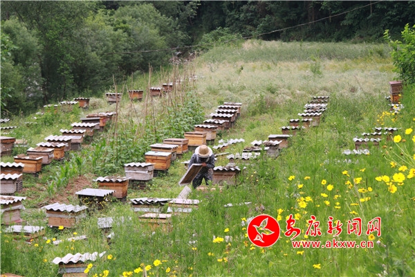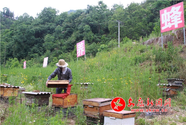 “那個(gè)就是老余,我們村中華蜂養(yǎng)殖園和養(yǎng)蜂農(nóng)民專業(yè)合作社的負(fù)責(zé)人......”順著營盤埡村支部書記劉賜堂手指的方向望去,只見一位頭戴防蜂面罩,身著格子襯衣的中年漢子正在花叢中整理蜂箱。
