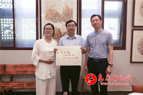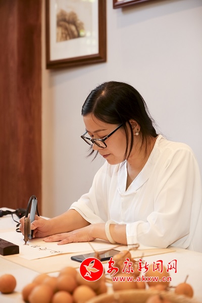 6月24日,李紅霞為安康日報(bào)社烙畫作字——“黨媒服務(wù)創(chuàng)新在一線”。烙畫又稱火筆畫,中國傳統(tǒng)藝術(shù)珍品,用火燒熱烙鐵在物體上熨出烙痕作畫。烙畫創(chuàng)作在把握火候、力度的同時(shí),注重“意在筆先、落筆成形”。
