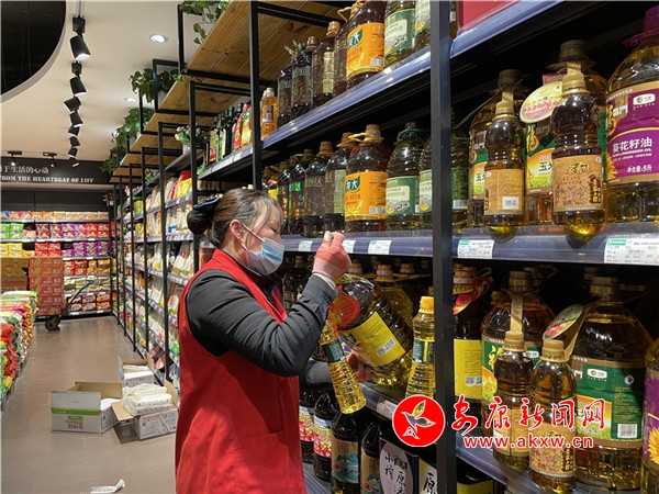 隨后,記者又來到了喜盈門超市中心店,工作人員會給每個進入人員進行體溫測量。超市內,工作人員也在持續(xù)給貨架補貨,貨架上物資很充足。