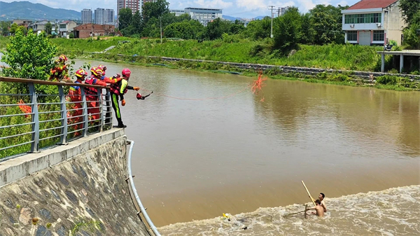 水中水流又大又急,沖得王曉冬站不穩(wěn),沒辦法往岸邊去。王曉冬知道可能沒辦法憑借自己的能力上岸了,當(dāng)即決定向消防求救。“快打119!”王曉冬對岸邊的妻子大聲說道。王曉冬一邊說一邊將竹竿深深插入水中,他拉著孩子依靠著竹竿。