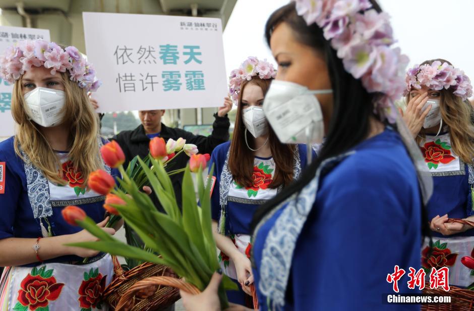 3月30日,六位靚麗“花仙子”統(tǒng)一著裝來到南京仙林地鐵二號線沿線新湖仙林翠谷,戴著過濾式口罩向過往的市民分發(fā)郁金香,以此提醒人們對空氣環(huán)境的關注、倡導綠色環(huán)保生活。中新社發(fā) 泱波 攝Am6安康新聞網