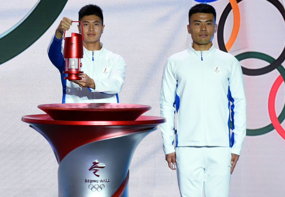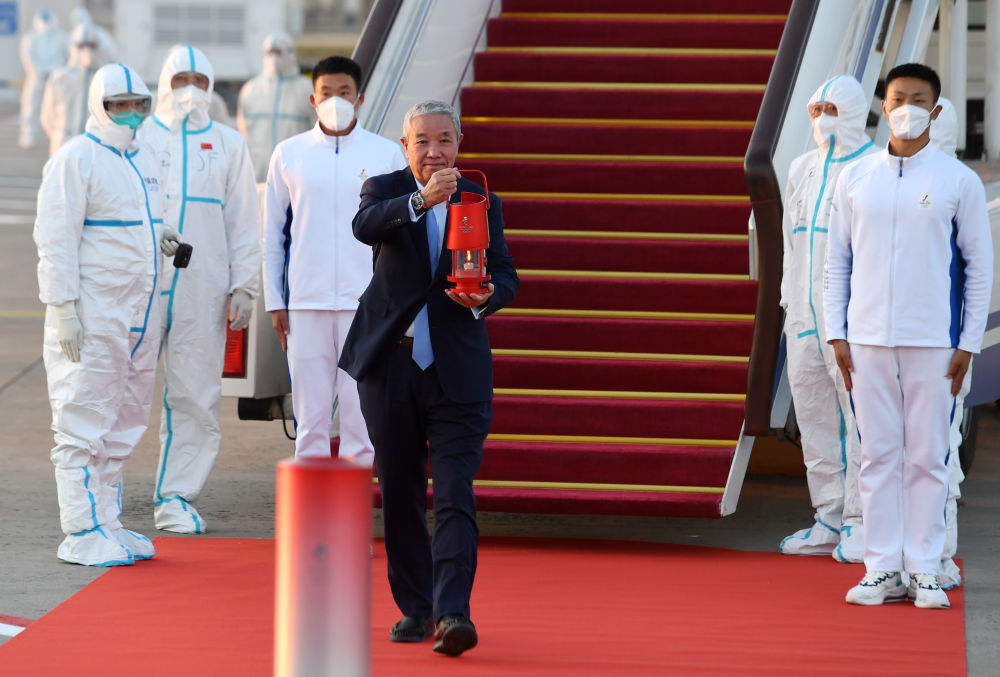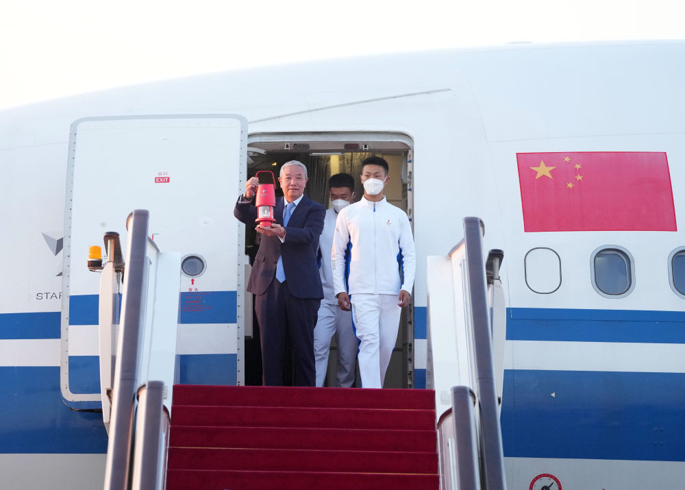 ⬆️北京冬奧組委特別代表、北京冬奧組委副主席于再清(左)手持火種燈走出艙門。