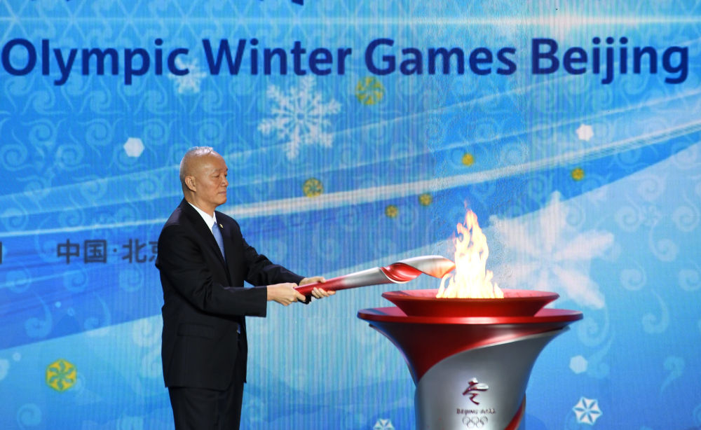 ⬆️在火種歡迎儀式上,北京市委書記、北京冬奧組委主席蔡奇點(diǎn)燃儀式火種臺(tái)。