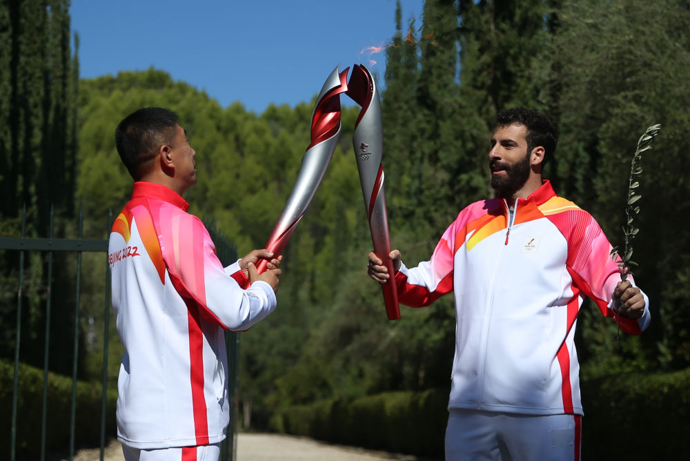 10月18日,希臘高山滑雪運(yùn)動員揚(yáng)尼斯·安東尼烏(右)將火種傳遞給第二名火炬手——前中國短道速滑運(yùn)動員李佳軍。新華社記者 鄭煥松 攝