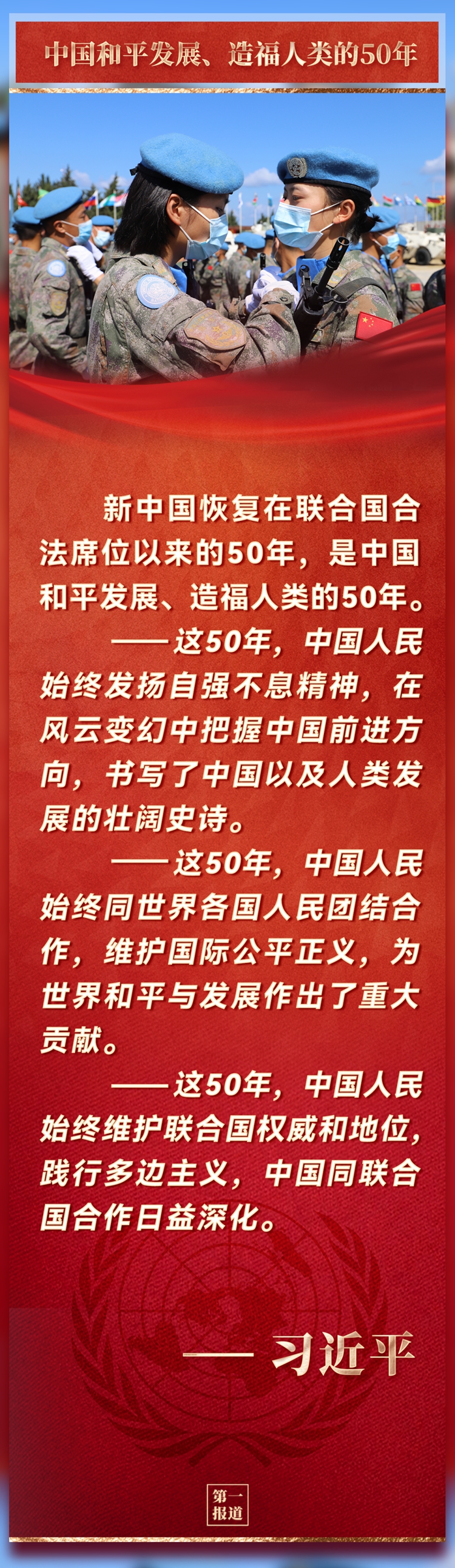 新中國(guó)恢復(fù)在聯(lián)合國(guó)合法席位以來(lái)的50年,是中國(guó)和平發(fā)展、造福人類的50年。