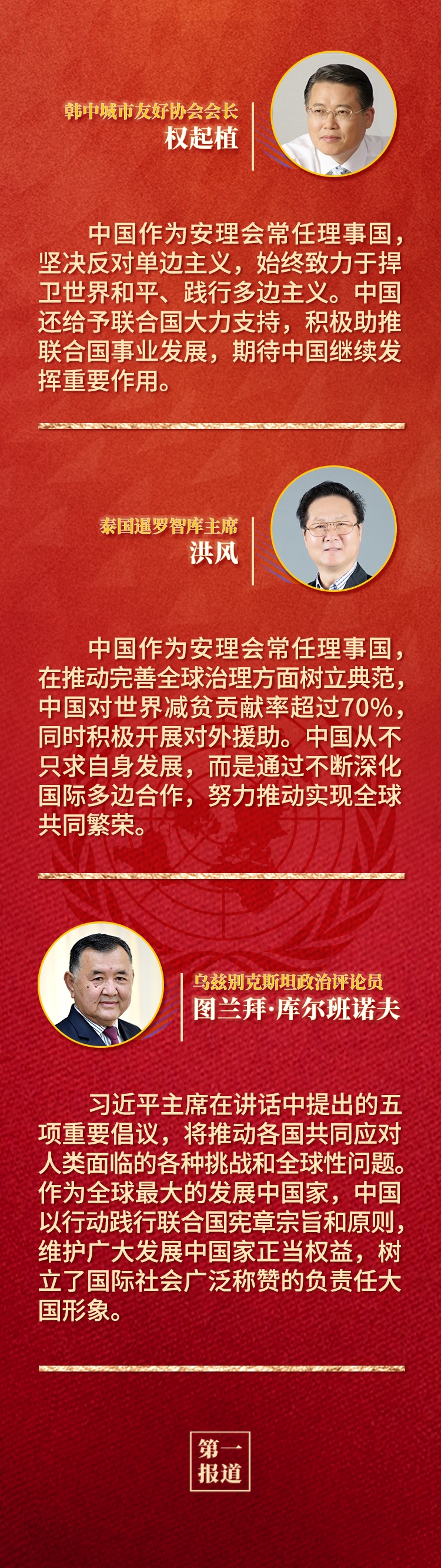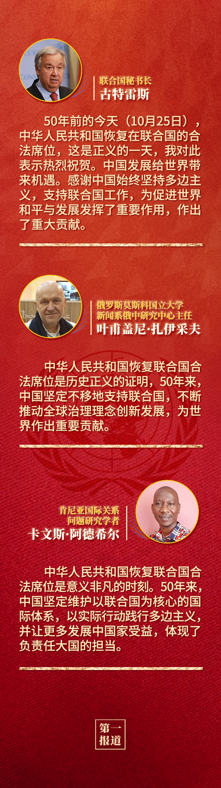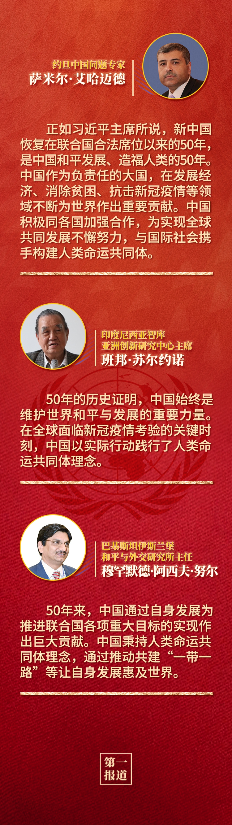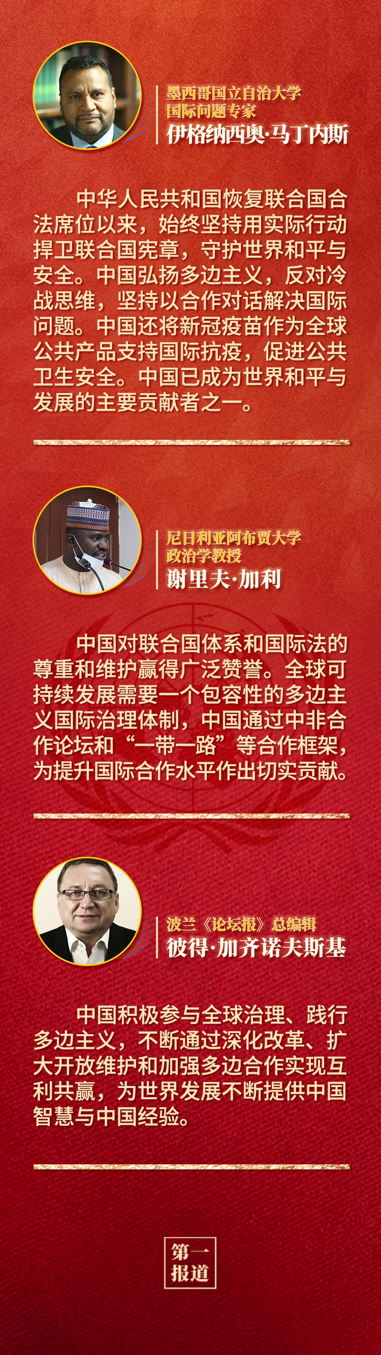 多國(guó)人士認(rèn)為,中華人民共和國(guó)恢復(fù)聯(lián)合國(guó)合法席位是世界和聯(lián)合國(guó)歷史上的一個(gè)大事件,習(xí)近平主席的重要講話回顧了中國(guó)和平發(fā)展、造福人類的50年,為實(shí)現(xiàn)世界永續(xù)和平發(fā)展提出重要倡議,為全球共同推動(dòng)構(gòu)建人類命運(yùn)共同體注入新的強(qiáng)大動(dòng)力。