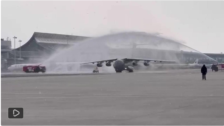 11時(shí)30分許,飛機(jī)抵達(dá)遼寧沈陽,長(zhǎng)眠異鄉(xiāng)七十余載的英烈回到祖國(guó)。隨后,飛機(jī)緩緩?fù)ㄟ^象征著最高禮遇的“水門”。