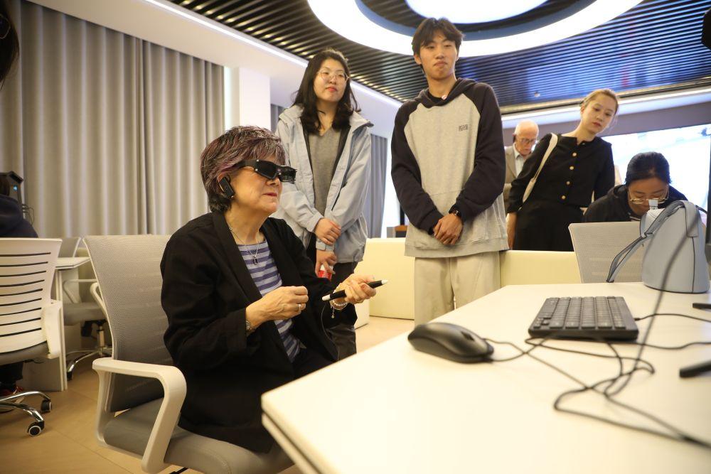 4月15日,在培黎職業(yè)學(xué)院,英中了解協(xié)會榮譽主席佐伊·里德體驗學(xué)生們親手設(shè)計搭建的虛擬現(xiàn)實場景模型。新華社記者 張智敏 攝