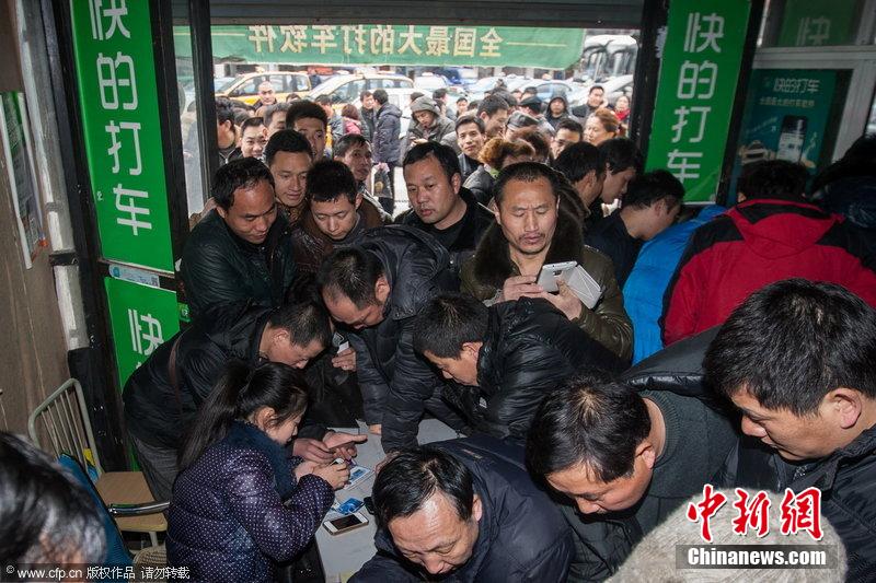 2014年2月19日,杭州,隨著“嘀嘀”、“快的”兩家打車(chē)軟件的“燒錢(qián)”競(jìng)賽愈演愈烈,眾多出租車(chē)司機(jī)來(lái)到兩家打車(chē)軟件公司的杭州服務(wù)點(diǎn),排隊(duì)安裝司機(jī)版軟件。司機(jī)們表示,安裝打車(chē)軟件,一是為了緊跟潮流方便做生意,二是可以得到更多的“獎(jiǎng)勵(lì)”補(bǔ)貼。5kE安康新聞網(wǎng)