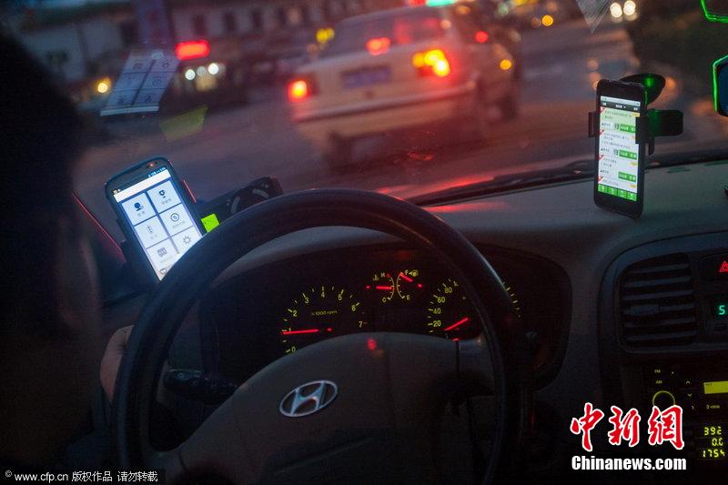 2014年2月19日,杭州,一位出租車司機(jī)同時(shí)開著兩款打車軟件。圖片來(lái)源:CFP視覺中國(guó)