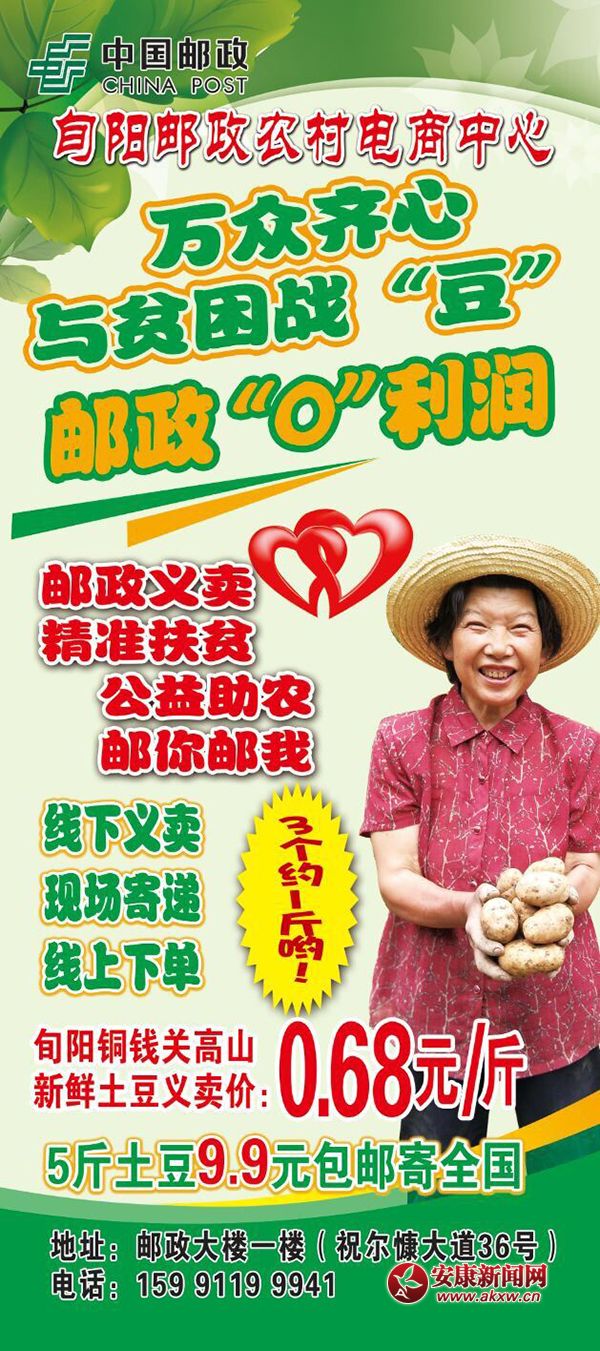 現(xiàn)在,旬陽郵政科學(xué)合理的解決供給矛盾:經(jīng)過實(shí)地考察后,為解決農(nóng)民銷路難題,積極響應(yīng)縣委、縣政府“打贏脫貧攻堅(jiān)戰(zhàn)”的號召,第一時間利用行業(yè)優(yōu)勢,通過“愛心義賣+愛心寄遞+線上訂單”活動的方式將滯銷的土豆銷出去。