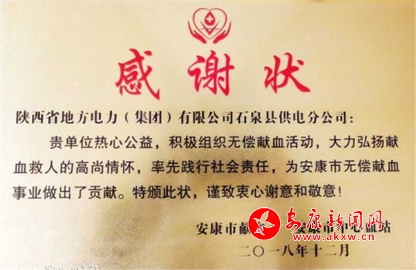 幾年來,石泉縣供電分公司無償獻(xiàn)血活動(dòng),得到上級(jí)組織的從分肯定。 2016年石泉縣供電分公司受到邀請(qǐng),參加了紀(jì)念“6.14”世界獻(xiàn)血者日,安康市人民政府舉辦的全市無償獻(xiàn)血促進(jìn)會(huì),作了無償獻(xiàn)血工作經(jīng)驗(yàn)交流發(fā)言,作為全市唯一的企業(yè)代表,電力人深感自豪和光榮;同年被安康市無償獻(xiàn)血領(lǐng)導(dǎo)小組辦公室、安康市紅十字會(huì)、安康市衛(wèi)生和計(jì)劃生育局聯(lián)合授予“安康市無償獻(xiàn)血愛心合作單位”,成為石泉縣第一家被授予無償獻(xiàn)血愛心合作的單位;2017年榮獲“市級(jí)無償獻(xiàn)血工作促進(jìn)獎(jiǎng)先進(jìn)集體”;2018年12月安康市、安康市中心血站送來“感謝狀”這一系列成績(jī)的取得為石泉縣供電分公司省級(jí)精神文明標(biāo)兵單位增色添彩,同時(shí)石泉縣供電分公司也是全縣僅此一家“省級(jí)精神文明標(biāo)兵單位”保持者,公司更高的目標(biāo)是創(chuàng)建“全國(guó)精神文明單位”這是幾代石泉電力人的夢(mèng)想。
