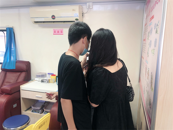 中秋節(jié)不僅街上熱鬧,獻(xiàn)血車上也熱鬧,鄧孟杰正坐在采血椅上獻(xiàn)血,他漂亮大方的女友站在旁邊跟他聊著晚上要吃什么,女友的弟弟坐在遠(yuǎn)一點(diǎn)的地方玩著手機(jī),女友的媽媽則坐在體檢桌前測(cè)量血壓,“一人獻(xiàn)血,三人陪同”的場(chǎng)景著實(shí)有點(diǎn)可愛(ài),但鄧孟杰笑得十分開(kāi)心,一直想獻(xiàn)血的他特別選了中秋這個(gè)日子,大概也是想和愛(ài)人親人一起分享這種美妙的人生體驗(yàn)。鄧孟杰的女友拿起他的獻(xiàn)血證撒嬌到:“這次我們陪你,下次你也要陪我來(lái)獻(xiàn)血。”說(shuō)完把手機(jī)塞給了一旁的弟弟,指揮他給自己和男友拍合照,一邊打趣弟弟拍照技術(shù)不好一邊把男友手里獻(xiàn)血證的位置調(diào)了又調(diào)。