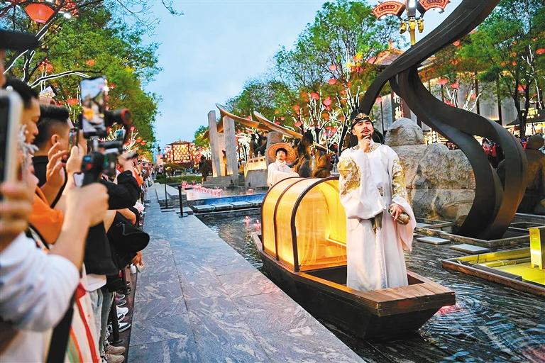 與唐裝“仕女”擦肩而過,穿行于貞觀之治雕塑群,與“李白”吟詩作對……步入大唐不夜城街區(qū),歷史便翩然而至。