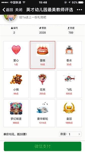 “幼兒園網(wǎng)絡(luò)投票評選最美老師,竟然還可以買禮物代替投票,這算不算變相讓家長花錢給老師?”豐禾小區(qū)英才幼兒園評選最美老師活動引發(fā)爭議,有家長如是說。投票者可送出的禮物從1點愛心到1888點的皇冠不等,其中1點就是1元。