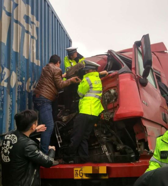 上午10時20分,在福銀高速長武至西安方向1860千米處,永長中隊副中隊長穆曉鵬和民警吳陳明、鄭強正在疏導分流車輛時,突然聽見對面道路上行方向傳來一聲巨響。隨后,他們立即趕赴現(xiàn)場發(fā)現(xiàn)在上行K1860 400米處貨車道有一輛蘇G牌照重型半掛車與一輛陜A牌照重型集裝箱貨車追尾,蘇G牌照車輛內有人受傷被困。