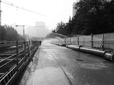 在西安地鐵五號(hào)線(xiàn)6標(biāo)中鐵電氣化局施工的高新四路車(chē)站工地記者看到,作為西安地鐵首批噴淋系統(tǒng)試驗(yàn)點(diǎn),施工單位將防塵減霾噴淋系統(tǒng)安裝在工地圍欄1.5米高位置,管線(xiàn)長(zhǎng)度達(dá)680米,噴頭68個(gè),其中,每10米設(shè)置一個(gè)旋轉(zhuǎn)噴頭,噴射射程最大可至12米,覆蓋的面積約3000多平方米。每個(gè)噴頭上設(shè)置有閥門(mén),可根據(jù)現(xiàn)場(chǎng)情況,調(diào)節(jié)射程、水量及角度。