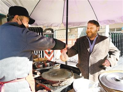 每天上午,只要有時(shí)間,他都會準(zhǔn)時(shí)來到西安外國語大學(xué)雁塔校區(qū)北門外,買一份煎餅果子當(dāng)早餐。煎餅攤的張老板和他是“老熟人”了!拔业闹形娜窃陲堭^點(diǎn)餐時(shí)練習(xí)出來的,比如‘泡饃’‘biangbiang面’‘肉夾饃’,全是我的最愛。”約翰開玩笑地說,西安人的學(xué)習(xí)熱情很高,知道他來自美國后,通常會跟他練習(xí)英語口語,沒人找他聊中文。因此,他的中文水平至今也沒能提高多少!拔业母改浮⑴笥褋砦靼矔r(shí),我可是他們的美食導(dǎo)游。哪家羊肉泡饃好吃,我都清楚!奔s翰笑稱自己已經(jīng)養(yǎng)成了“陜西胃”,特別愛吃西安的各類美食。