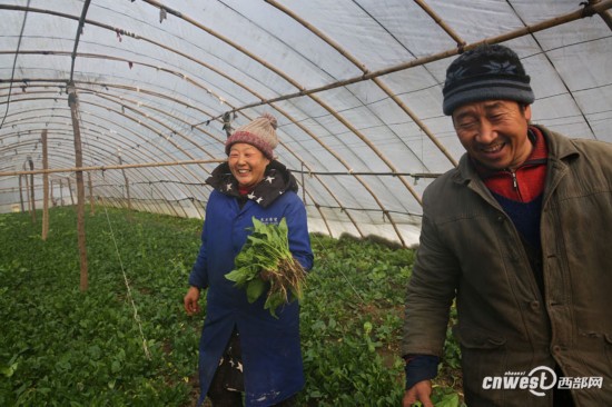 1月28日,安康鎮(zhèn)坪縣板橋村,陳維兵、何登琴夫妻在家門口的蔬菜大棚收菜,看著綠油油的菠菜,夫妻倆心里特開(kāi)心。(記者 魏永賢)nhx安康新聞網(wǎng)
