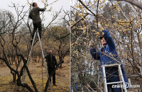 西部網(wǎng)訊(記者 魏永賢) 3月5日,西安興慶宮公園,6名園林工人在臘梅林里摘臘梅花,他們要把臘梅林里的臘梅花全部除掉。