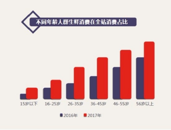 對(duì)比不同年齡段的消費(fèi)結(jié)構(gòu)可以發(fā)現(xiàn),50后、60后和70后用戶的生鮮消費(fèi)在全站消費(fèi)占比最高,可見(jiàn)“銀發(fā)經(jīng)濟(jì)”效應(yīng)在生鮮電商領(lǐng)域更為明顯,網(wǎng)上買菜、買肉的習(xí)慣也在逐步取代菜市場(chǎng)在中老年人心里的地位。